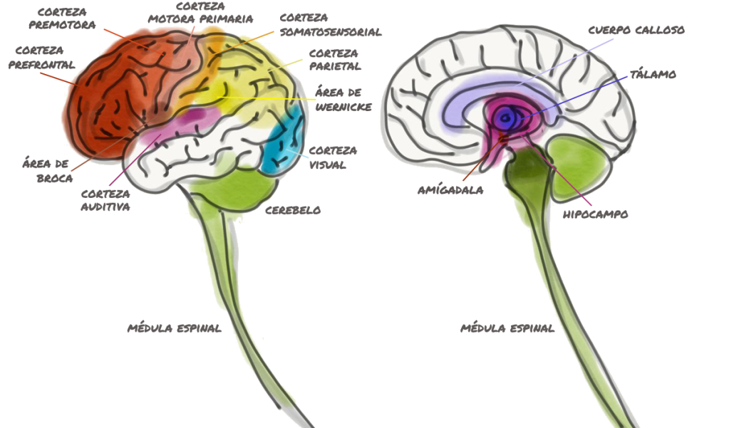 Con todos estos procesos, está claro que deben establecerse numerosas redes neuronales cuando tocamos música. Las principales áreas activas son la corteza auditiva, la corteza visual (para leer partituras), la corteza motora (para planificar el movimiento de los dedos), la corteza prefrontal (para el control del movimientos, la atención y el rastreo de errores), el cerebelo (encargado de los movimientos automáticos), el hipocampo (almacén de la memoria), las áreas de Broca y Wernicke (principales áreas del lenguaje) y el sistema límbico (amígdala, hipocampo, hipotálamo…). Por otra parte, el hemisferio izquierdo analiza la armonía como si fuera una lectura y el derecho procesa el ritmo y el manejo de las emociones.