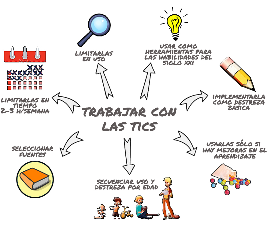 LIMITARLAS EN TIEMPO. Tal como han demostrado varios estudios, utilizar las tecnologías más de 2 o 3 horas a la semana en las aulas implica una disminución de las competencias lingüísticas, matemáticas y científicas. Saber cuál es el tiempo necesario para tener un buen aprovechamiento sin menoscabar otras destrezas, es fundamental para un buen uso de las TICs.