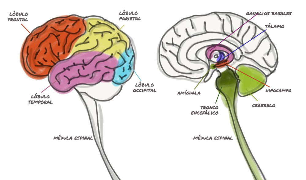 El córtex recubre los lóbulos: occipital, parietal, temporal y frontal, que se encuentran por pares, atendiendo a los dos hemisferios. El lóbulo temporal, además, incluye la estructura subcortical (debajo del córtex), en su región medial, donde se alojan los ganglios basales, el hipocampo y la amígdala, encargados de la automatización de movimientos, la memoria a largo plazo y las emociones, respectivamente.