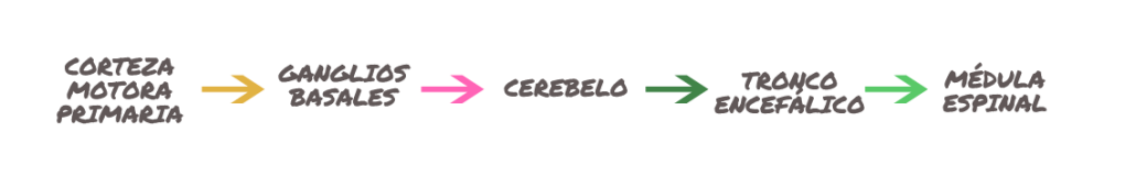 La corteza sensoriomotora primaria es la que se encarga de planificar los movimientos y los ganglios basales y el cerebelo están principalmente implicados en la ejecución de acciones automáticas, preaprendidas. La información pasa al tronco encefálico y de ahí a la médula espinal, que será la que envíe las órdenes a los músculos y los huesos para ejecutar el movimiento.